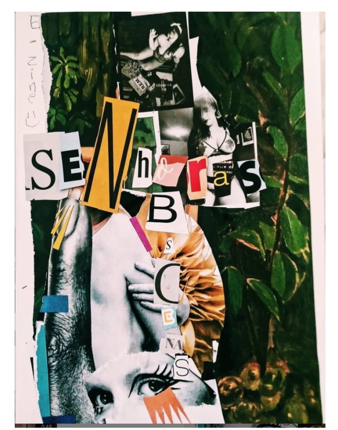 Assim, ao longo do mês de julho, montamos a capa com uma colagem manual de minha autoria e realizamos uma chamada pública por e-mail e nas redes sociais do projeto, depois, foi feita uma curadoria para a seleção dos textos publicados na primeira edição da zine das Senhoras Obscenas.